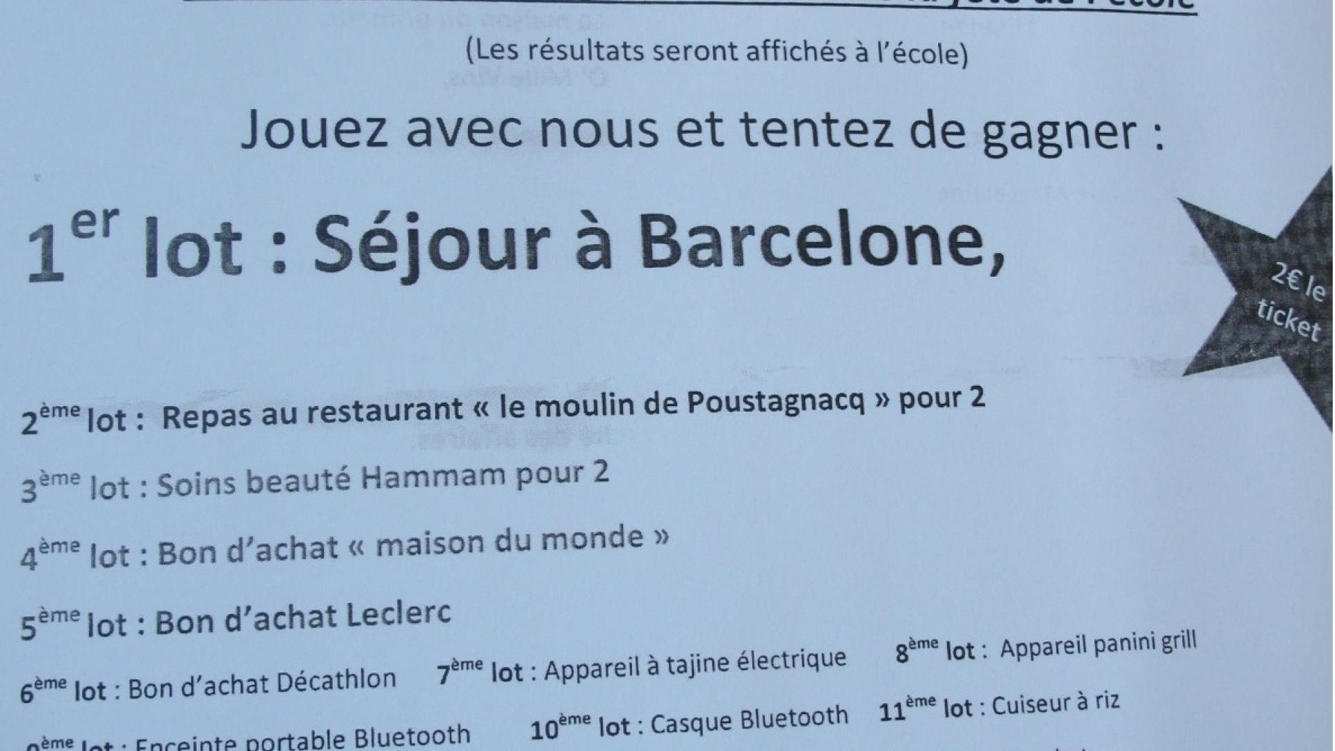 Le conseil local des parents d'élèves de Souprosse organise une grande tombola (2€ le ticket), plus de 2 000€ de lots à gagner, le 1er lot est un séjour à Barcelonne.