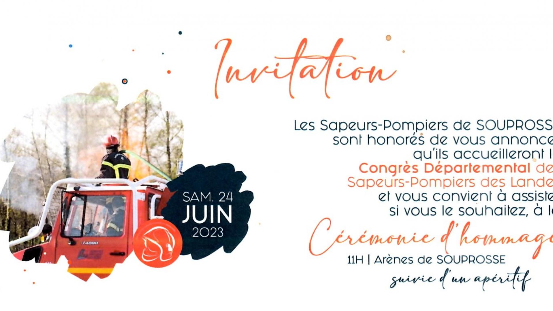 Accueil Souprosse Vivre à Souprosse Les actus de Souprosse Archives 2023 Pompiers - Congrès Départemental Les sapeurs-pompiers de SOUPROSSE accueilleront le Congrès Départemental des sapeurs-pompiers des Landes. Pompiers - Congrès Départemental Publié le 21 juin 2023 / Dernière modification le 31 août 2023 Pompiers - Congrès Départemental Publié le 21/06/2023 - Dernière modification le 31/08/2023 Cérémonie d'hommageSamedi 24 juin 2023à 11H00 aux arènes de SOUPROSSE