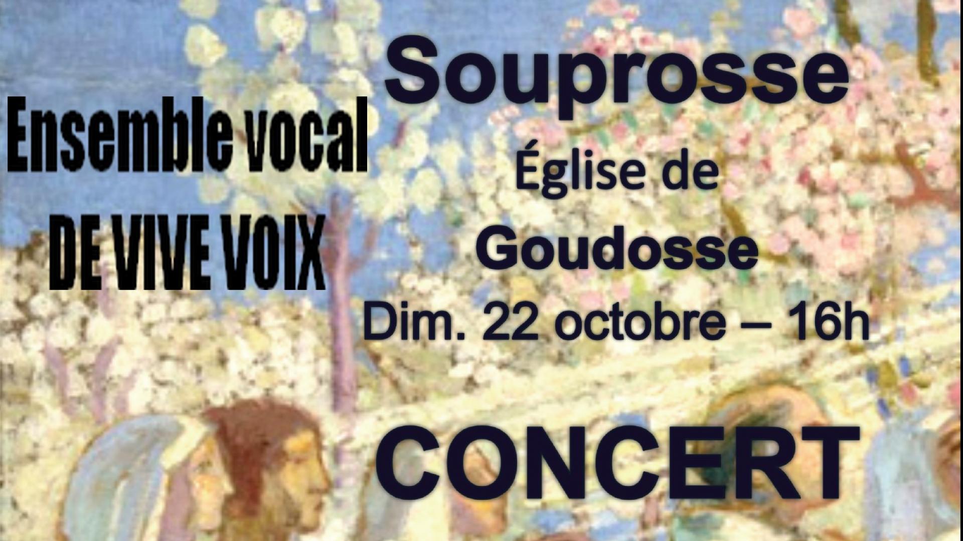 Accueil Souprosse Vivre à Souprosse Les actus de Souprosse Archives 2023 Concert - Ensemble vocal DE VIVE VOIX Dimanche 22 Octobre, l'ensemble vocal DE VIVE VOIX Concert - Ensemble vocal DE VIVE VOIX Publié le 17 octobre 2023 / Dernière modification le 09 novembre 2023 Concert - Ensemble vocal DE VIVE VOIX Publié le 17/10/2023 - Dernière modification le 09/11/2023 se produira en l'Eglise de GOUDOSSE à 16H.Venez nombreux écouter l'ensemble vocal.